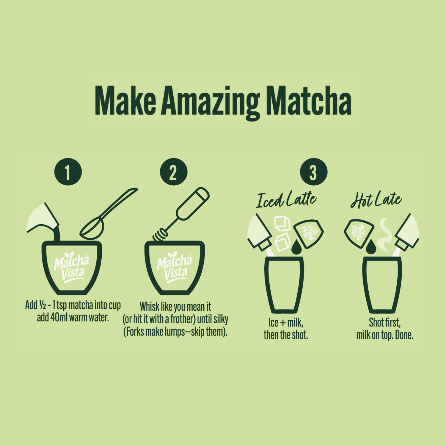 Berba se odvija u savršenim uvjetima — idealna nadmorska visina, širina, vlaga i količina padalina. Naša matcha ručno se prikuplja i melje kamenom u malim serijama.